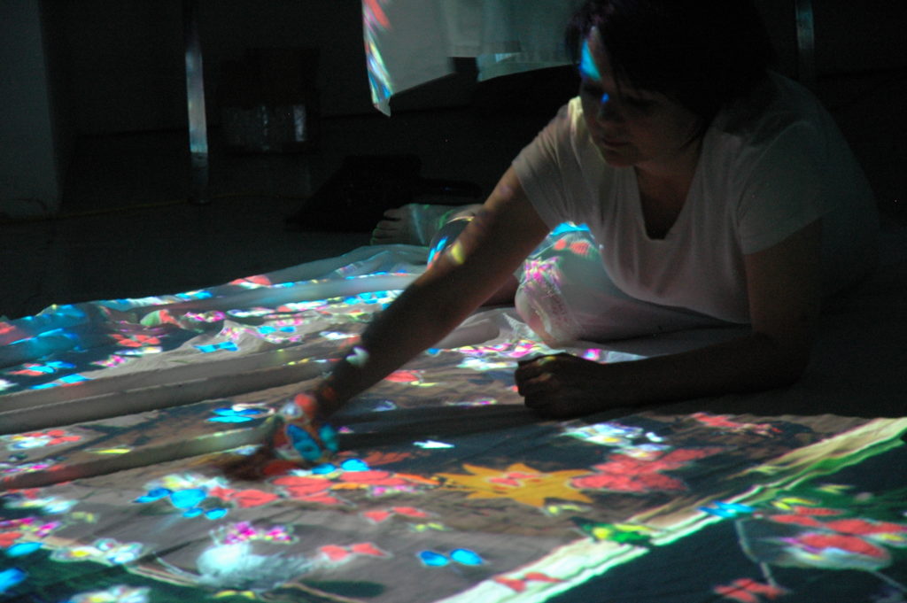 Upside Down World (Pearls for Pigs) is a hybrid-reality performance piece for one live performer and two avatars. Video of the the live performance space is streamed into Second Life as the virtual performance space is projected onto the floor. The performer and avatars interact in real time.