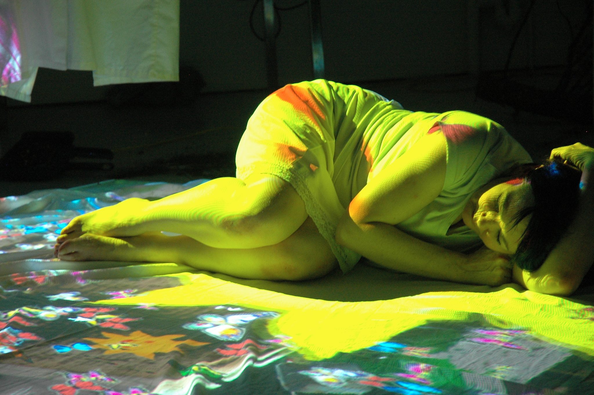 Upside Down World (Pearls for Pigs) is a hybrid-reality performance piece for one live performer and two avatars. Video of the the live performance space is streamed into Second Life as the virtual performance space is projected onto the floor. The performer and avatars interact in real time.